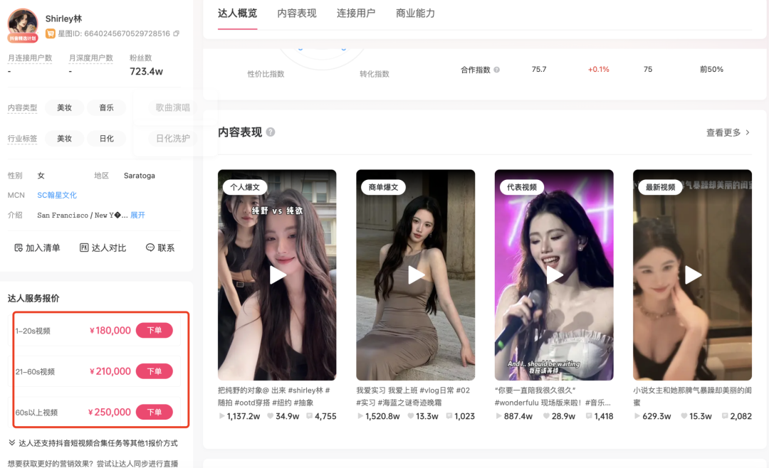 巨星图表显示,“Shirley林”是MCN机构SC翰星文化旗下的大咖,1~20秒广告报价18万元,21~60秒广告报价21万元,超过60秒广告报价25万元。