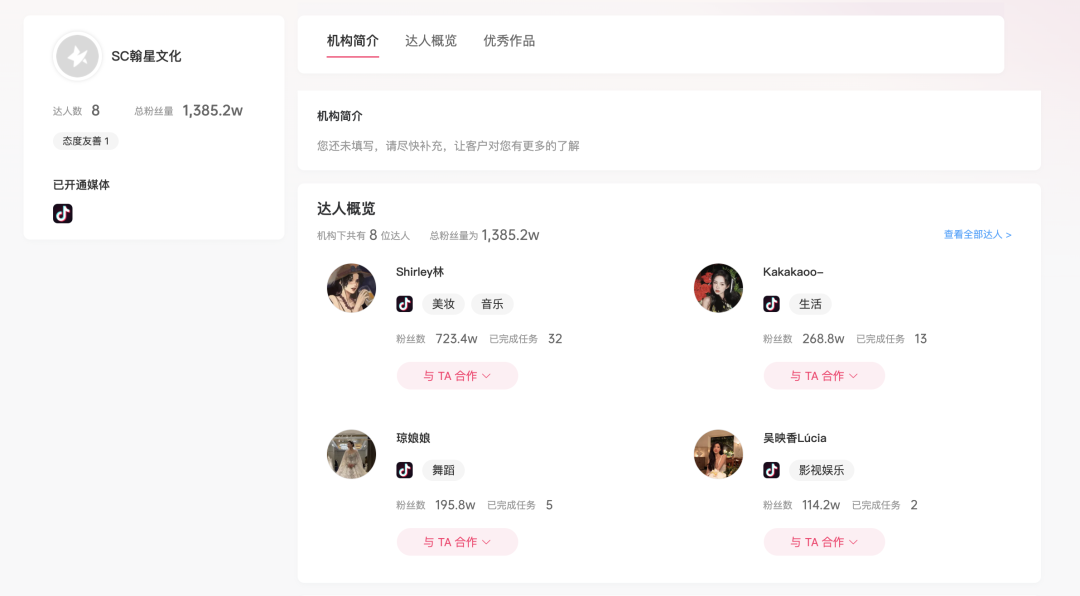 除“Shirley林”外,该机构还拥有多个百万粉丝,涉及生活、影视、时尚等诸多领域。