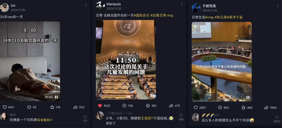 有了联合国光环的支持,有了精心打磨的照片和文案,博主们打造的精英设计就在纸上。这样的内容往往能吸引无数粉丝,博主们接受了评论区粉丝的仰望。此时此刻,他们似乎在另一个世界。