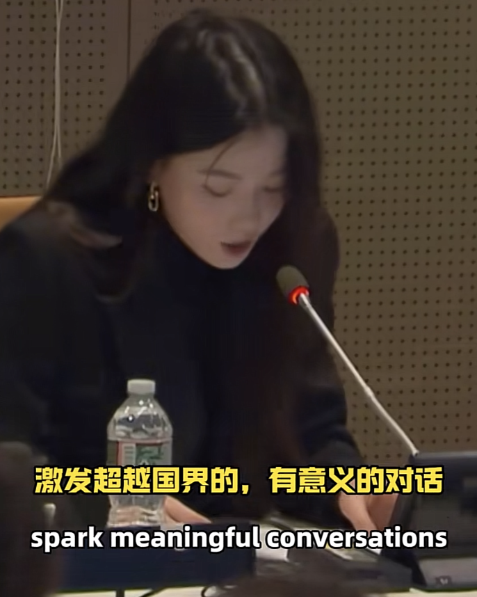 在文案中,男女开场第一句话是“今天是去联合国开会的一天”。后续分享的话题基本相同,包括“青少年成长、国际气候问题、儿童女性问题”等。