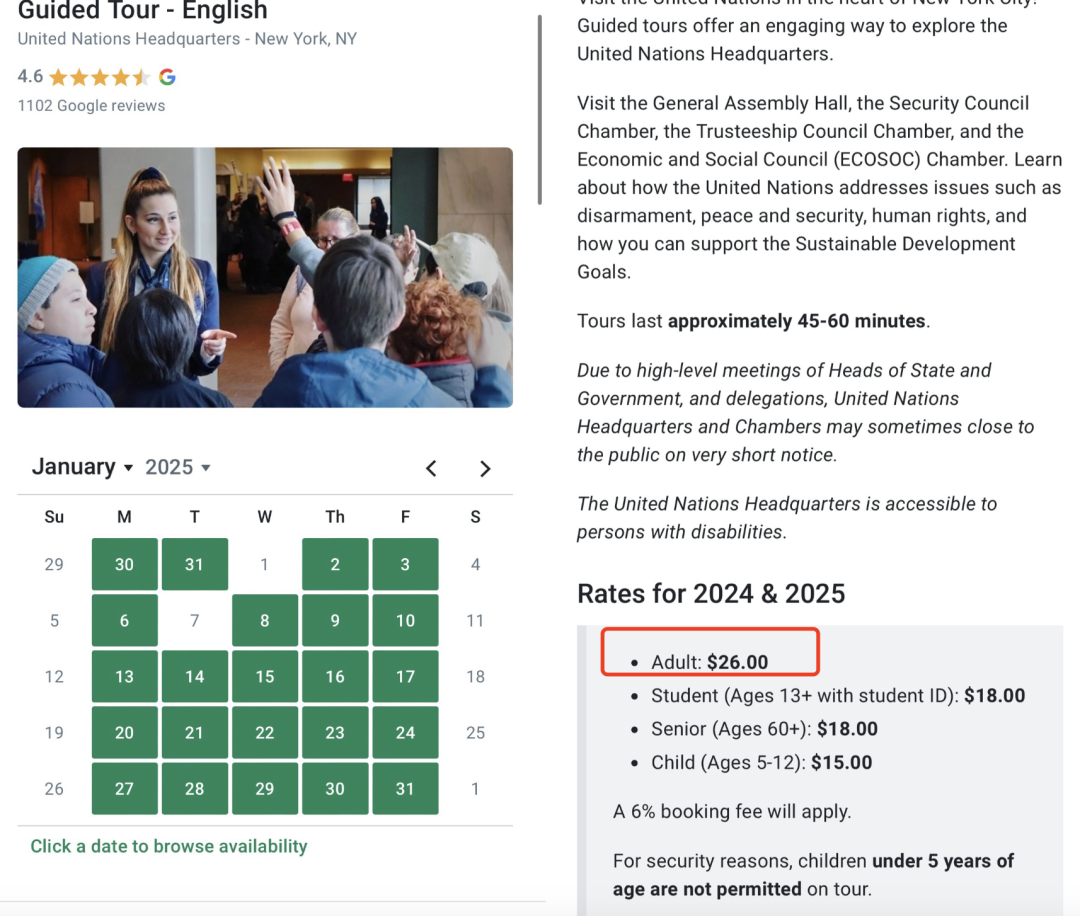 记者发现,联合国官网有一个预约访问的入口,成人价26美元,13岁以上的学生用学生证支付18美元,5-12岁的孩子支付15美元,60岁以上的老人支付18美元,现场提供多种语言的导游服务。 有关预约已到2025年1月。