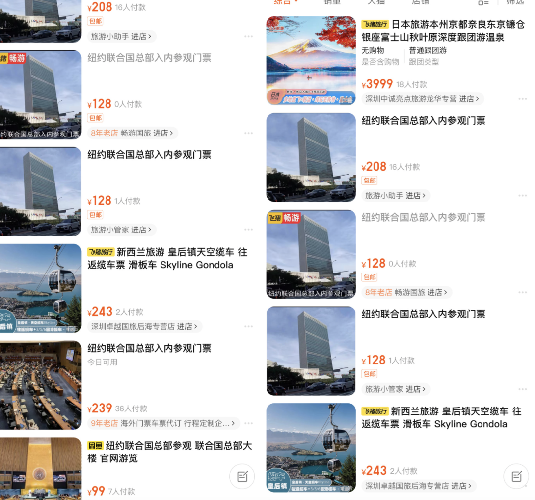 但是仔细对比可以发现,这些打卡联合国的内容似乎来自于同一条流水线,同样的打卡点,同样的文案,同样的视频风格,甚至剪辑的节奏都差不多。