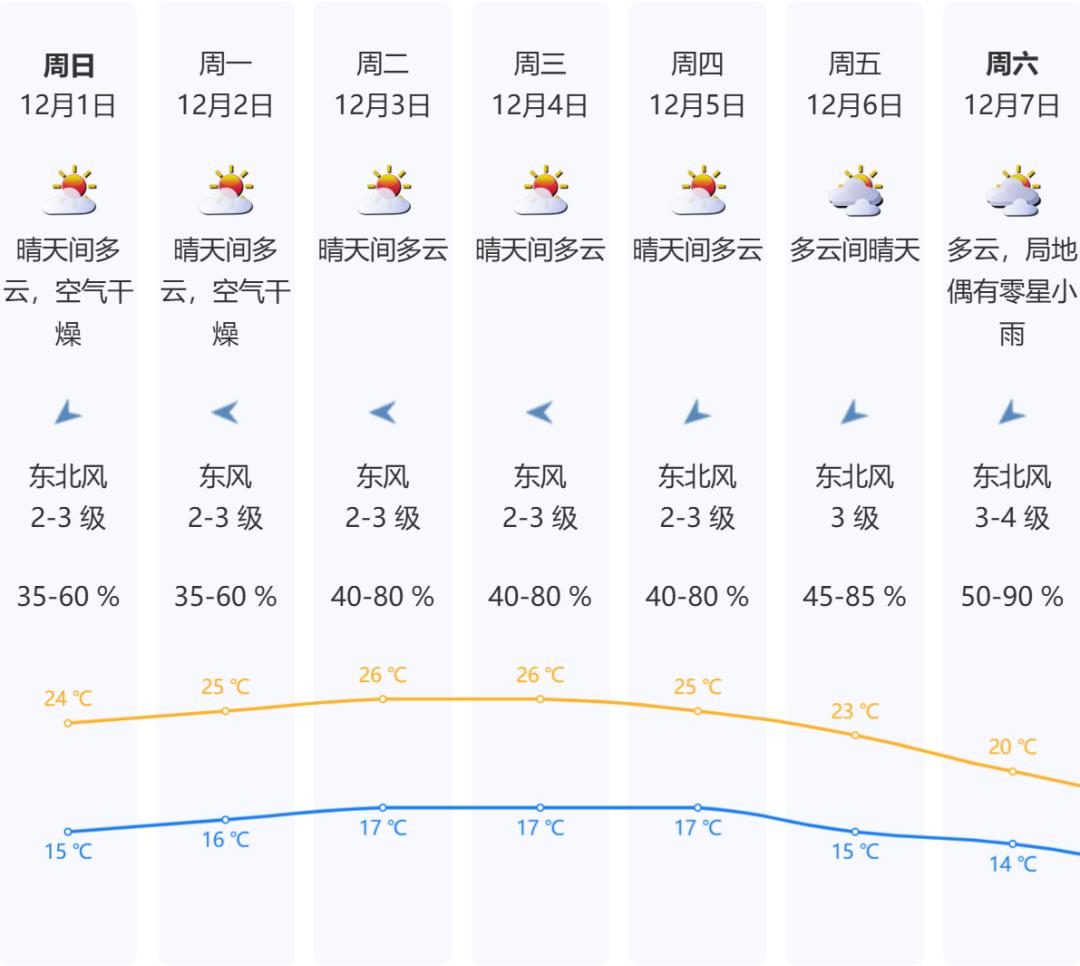 十二月一日,晴天多云,空气干燥;气温15℃-24℃;东北风2-3级;相对湿度为35%-60%。