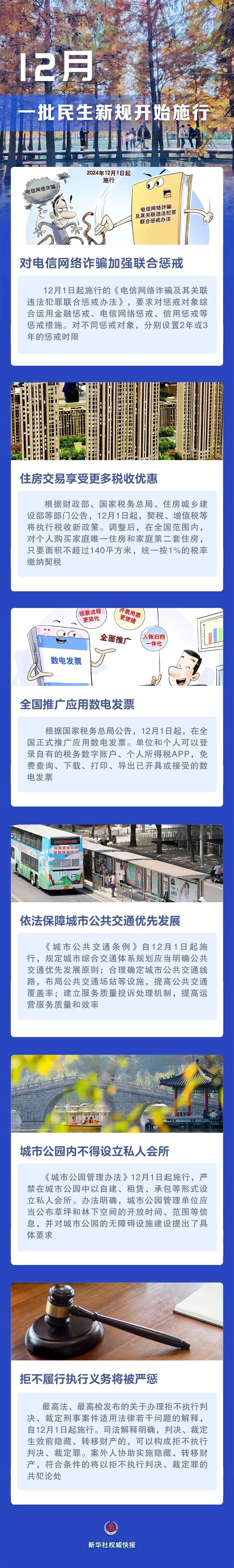 12月,一批与民生相关的新规定开始实施。加强对电信诈骗及其相关违法犯罪的联合处罚,保护您我的个人利益;调整多项房地产税收政策,享受更多住房交易优惠。