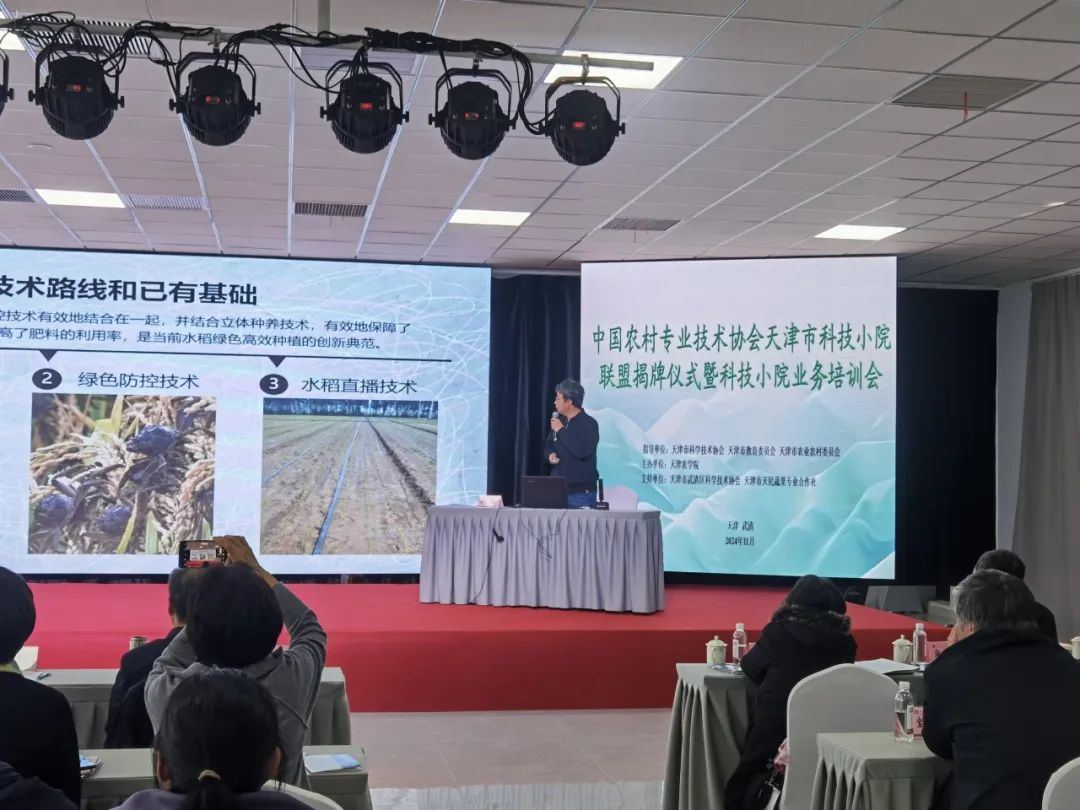 近日,在2024年中国农村专业技术协会天津市科技小院联盟揭牌仪式暨科技小院业务培训会上,天津宝邈小站稻科技小院副教授赵飞代表小院建设典型报告,分享经验。
