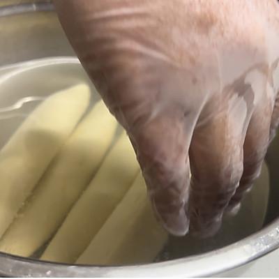 17、20 将冷冻好的面包胚放入碱水中。 30 几秒钟后捞出,记得戴手套。