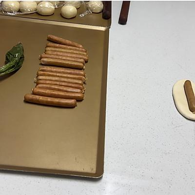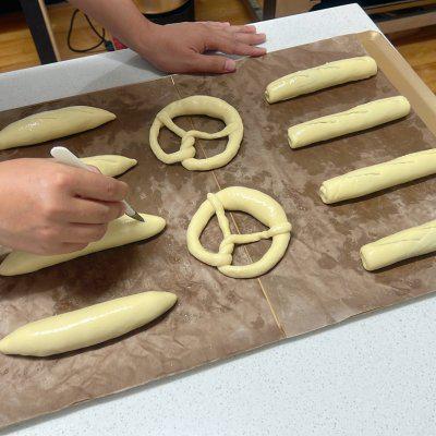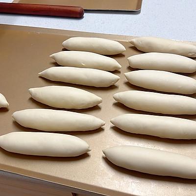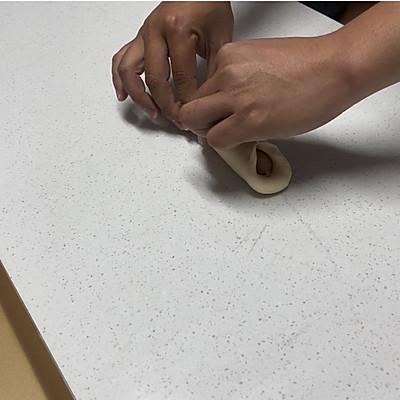 7、德肠碱水包,面团擀成牛舌状,加入德肠,