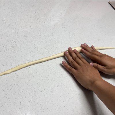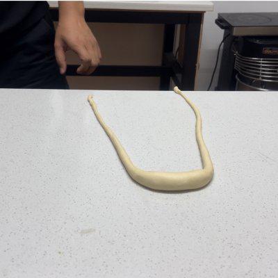 10、普雷结 面团整理成中间两端粗细的形状,大概 70-80cm 长