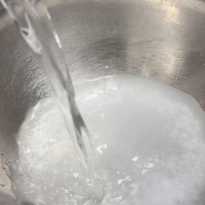 16、此时可调碱水啦,将食用碱倒入碗中,加水,搅拌均匀即可。