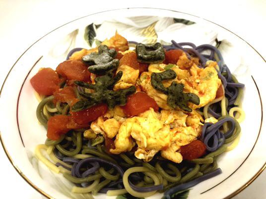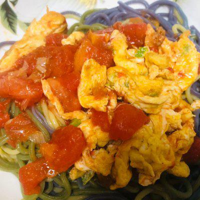 12、将番茄炒鸡蛋倒入三色面中,上面放上蒸好的生日快乐。 ( 见主图 ) 。