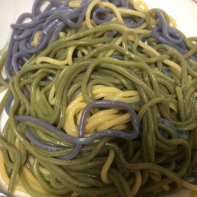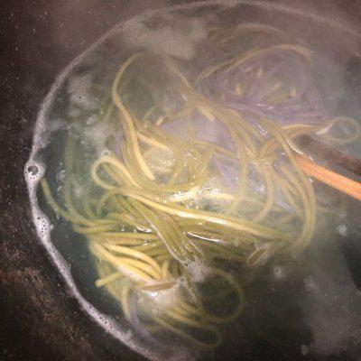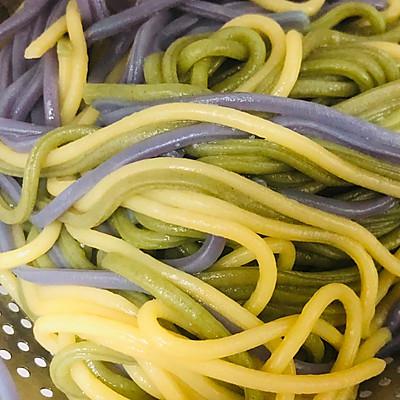 6、煮好的彩色面条在冷开水中过一会儿,沥干水分