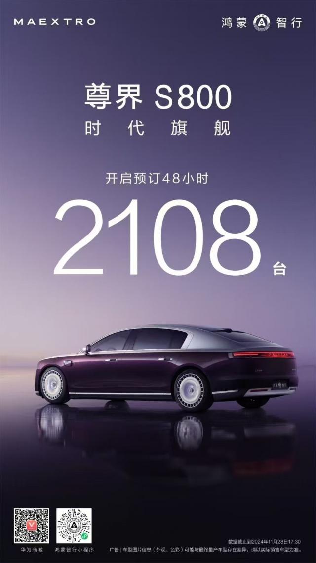 尊界 S800 正式亮相,代表着鸿蒙智行实现了从豪华到超豪华车型的全面覆盖。尊界界界是鸿蒙智行时代的旗舰, S800 预订正式开始后 48 在一个小时内,预订量就突破了 2108 台湾相当于竞争产品(奔驰 S+迈巴赫 S)销售总额为一个月。这一成就的实现,不仅展现了鸿蒙智行在超豪华车型市场的竞争力,也为其未来的发展提供了更多的动力。