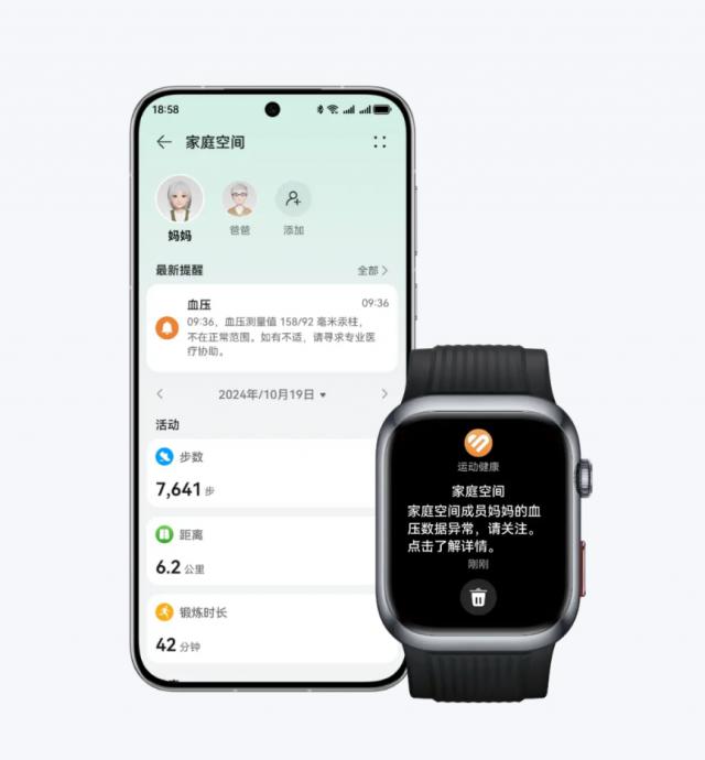 值得注意的是,HUAWEI WATCH D2 还创新性地推出了“家庭空间”功能。健康的华为运动 App,使用者可与家庭成员建立联系,实时查看家庭血压、心率、睡眠等健康数据,以及微体检报告。如果有异常数据,App 同时也会发出提示,让用户在第一时间关注家庭健康,并提供必要的帮助。对某些一直关心家庭健康的用户来说,这个功能无疑是一大福音。