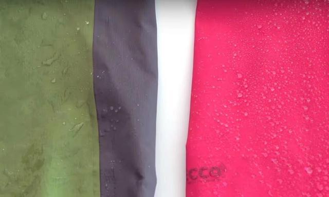 衣物表面的防水涂层可以通过洒水来检查是否损坏。如果喷到衣服表面的水聚成圆形水滴,很容易滚落,说明疏水涂层功能良好;如果看不到水滴,表面面料明显被水浸湿,说明疏水涂层已经损坏。