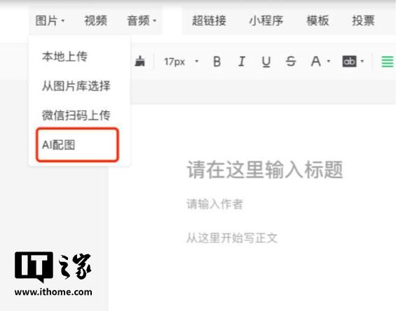 IT 世家 12 月 2 日消息,微信微信官方账号后台最近推出了一个全新的功能。在文章编辑过程中,除了传统的图片库选择和本地上传照片外,还增加了一个新的选项 ——" AI 配图"。