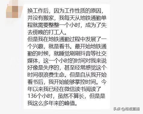 张女士的经历更特别。本来她只需要走十分钟就可以到达公司,但是换了工作之后,考虑到工作内容,她从来没有动过。现在,她的单趟地铁通勤时间长达 1 小时。她发现了一种新的兴趣——阅读,在习惯地铁长期通勤的过程中。“刚开始在地铁上,除了睡觉,我还在看抖音和一些社交媒体,感觉这一点。 1 浪费了一个小时。但是自从我开始读书之后,我就觉得自己成了时间的主人。今年以来,我一直在微信阅读中阅读。 136 一个小时,虽然不算太长,但是这是我多年来阅读的巅峰。"