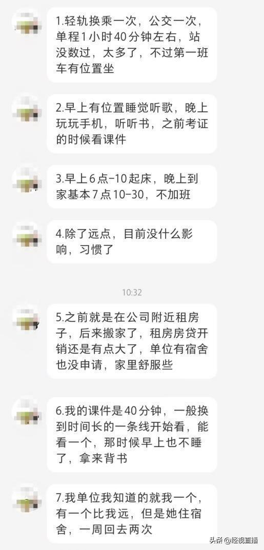 简女子在重庆工作,以前在公司附近租房,为了节省租金,经过充分考虑,决定搬回家住。现在,她每天都从家里出发,经过一次轻轨转移和一次公交换乘才能到达单位,至少需要一次通勤。 1 小时 40 分钟。简女士告诉记者,她每天早上都要去。 6 点 10 分开前起床,晚上下班 19 点击才能到家。当记者问,一次上下班将近两个小时是否会影响她的生活和工作时,简女士说她已经习惯了这种通勤方式。简女士告诉记者,在通勤过程中,她最常做的事情就是补觉和听歌。她还会在晚上下班的轻轨上听书。如果有一段时间需要研究,她会利用通勤时间看课件和背诵。