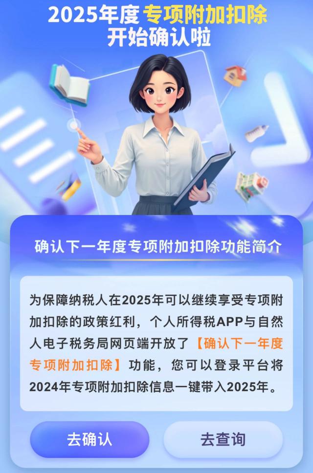 2025 确认年度个税特别附加扣除信息,12 月 1 日期开始。纳税人可以通过个税 APP,确定 2025 年度税收特别附加扣除信息。纳税人每年应当 12 月 1 日— 12 月 31 每天确定第二年享受专项扣除的内容。(详情请点击:中国税务报)