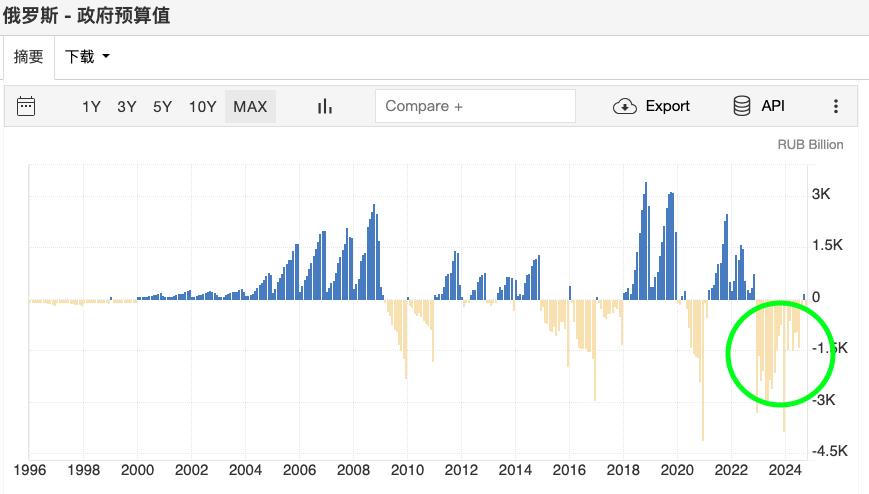从柱型上可以清楚地看出,俄罗斯一宣战财政从最初的微利直接进入了与2020年疫情刚刚开始的局面。