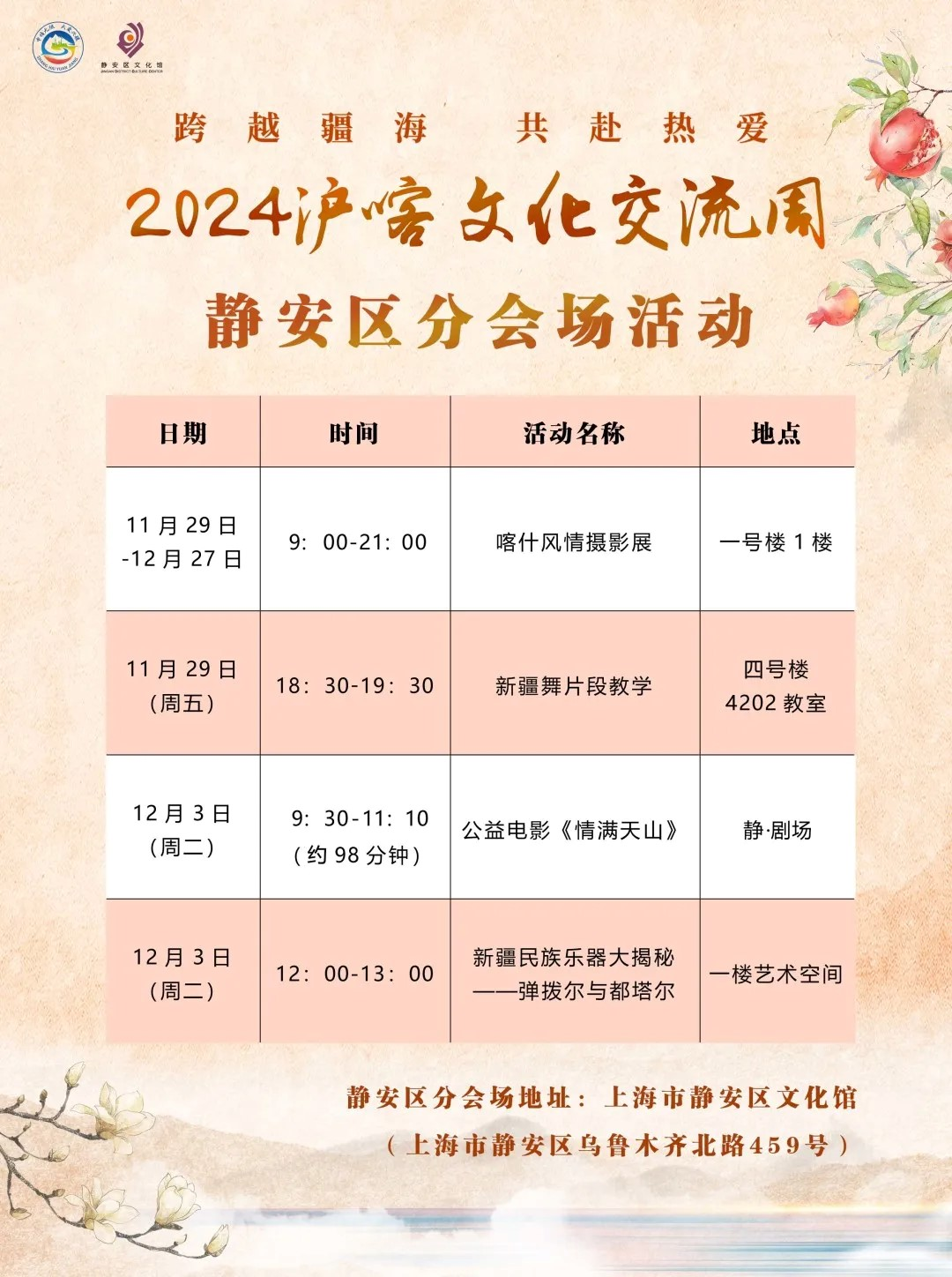这是2024沪喀文化交流周静安分会场的活动之一,“跨越疆海,一起热爱”。文化交流周期间,静安区文化馆将重点推进沪喀人文交流,通过展览、舞蹈、音乐、电影等方式举办公益电影《爱情满天山》。、一系列活动,如中午一小时喀什文章、公益课堂-新疆民族舞蹈教学等。,为两地的文化交流搭建了桥梁,继写了沪喀友谊的新篇章。