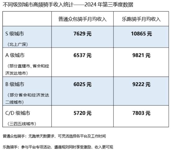 今年第三季度,全国高频骑手平均月收入在全国 5720 元到 10865 人民币之间。其中,高频乐跑骑手在三四五线城市的月平均收入为 7803 元,较 6 月份环比增长 8.42%;普通众包骑手的月平均收入为高频 5720 元,较 6 月份环比增长 2.86%。