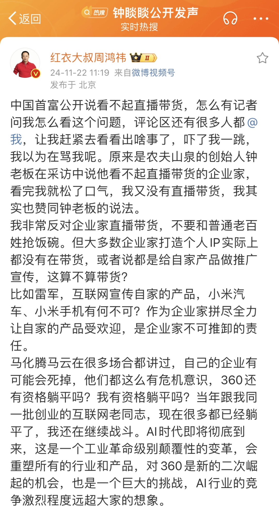 对此,周鸿祎表示赞同,认为企业家不应该与普通百姓争夺饭碗,涉足直播销售领域。