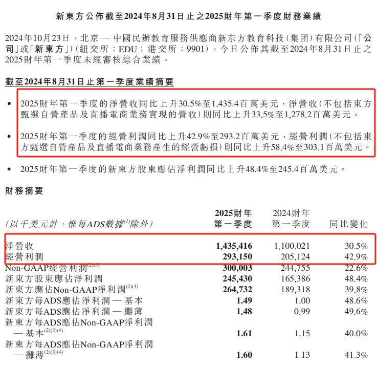 根据新东方公布的2025财年第一季度财务报告(2024年6月1日至8月31日),东方选择自营产品和直播电商业务造成经营损失,如果消除这部分经营损失,新东方本季度经营利润同比增长58.4%至3.03亿美元。