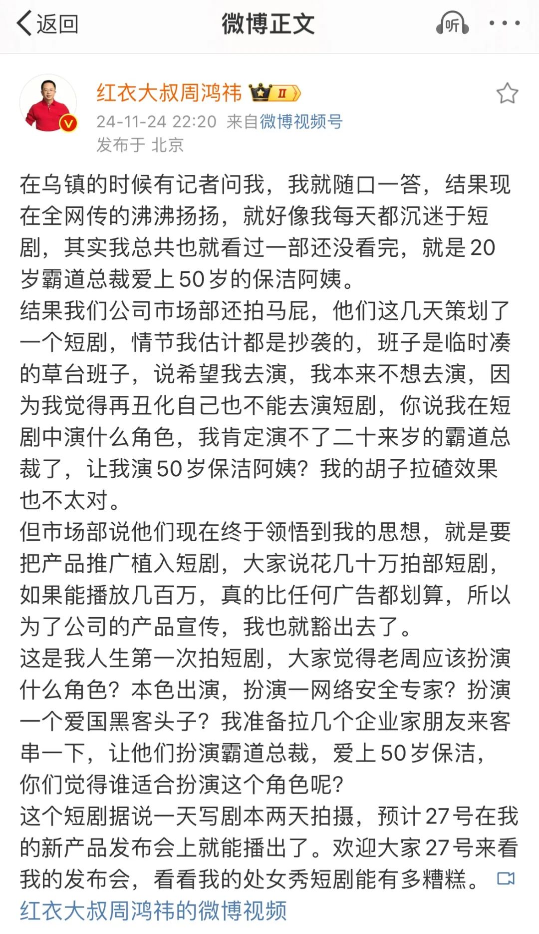 不过,周鸿祎对此并不满意。他对短剧这个行业的风口火热,并宣布将亲自参与短剧拍摄。