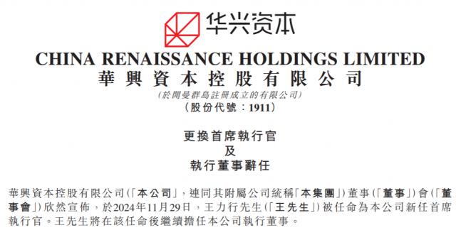 瑞财经 王敏 11 月 29 日本,华兴资本控股 ( 01911 ) 王力行被任命为公司新任CEO,任职后王力行将继续担任公司执行董事。