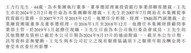 具体为:自 2007 年 7 月至 2015 年 12 月亮,王力行历任分析师、主管、TME 公司融资团队副总裁、董事、董事总经理; 2016 年 1 月至 2018 年 12 月,担任集团财务顾问业务部主管, 2019 年 1 从月份开始担任现任。