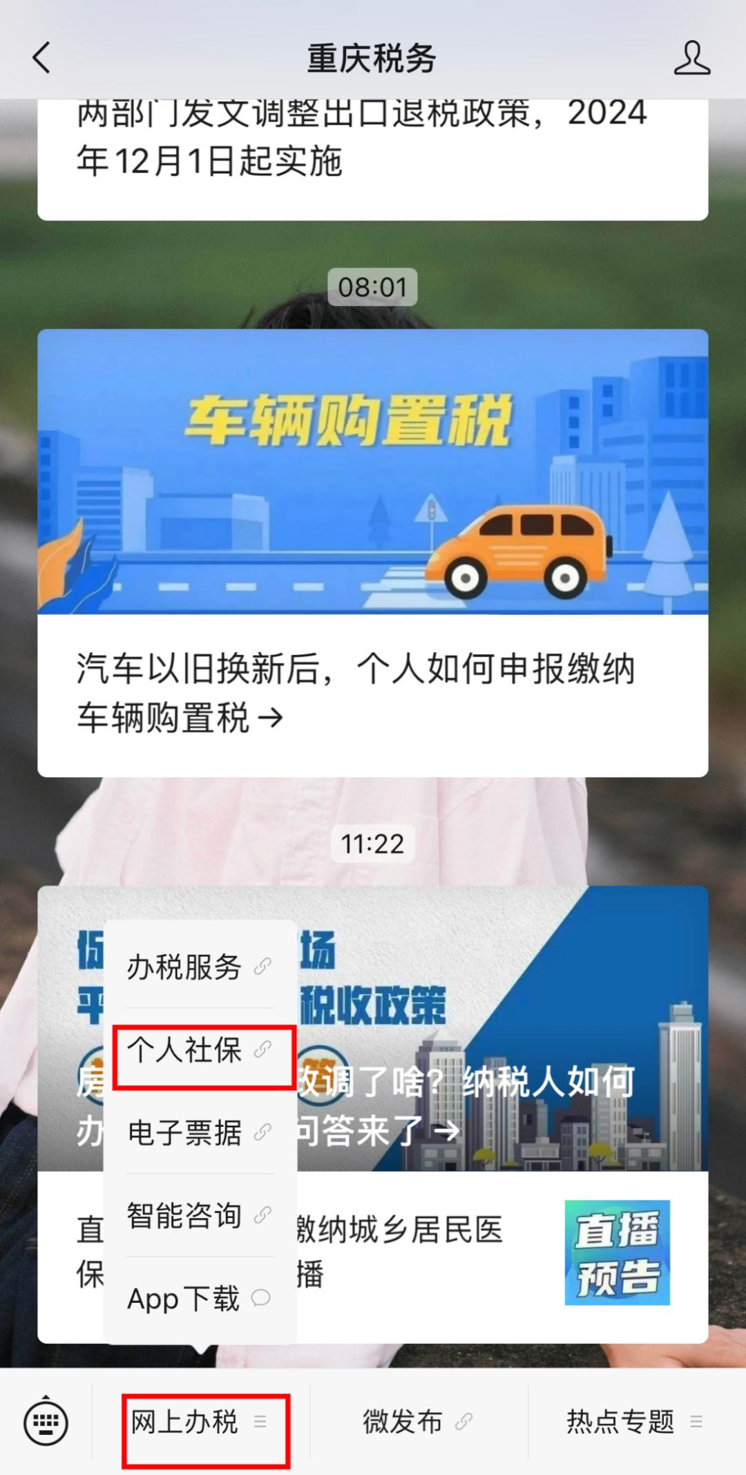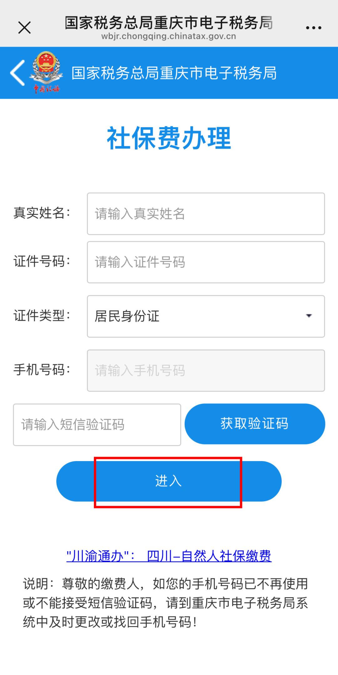 1.搜索“重庆税务”微信微信官方账号,点击【网上纳税】-【个人社保】,输入姓名、身份证号、手机号、验证码等信息,点击【进入】社保费用处理页面。