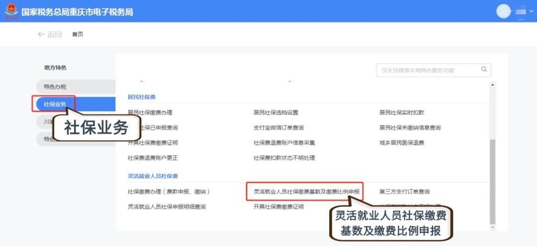 2.在电子税务局首页,依次点击【地方特色】-【社保业务】-【灵活就业人员社保缴存基数及缴存比例申请】进入功能页面。