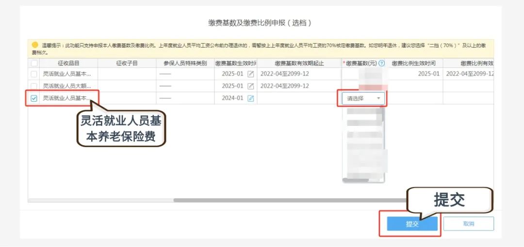 3.在“征用品”栏目中查看【灵活就业人员基本养老保险费】,在“存款基数”栏目中选择需要更改的支付栏目。点击【提交】,“设置成功”二字出现,表示等级变更成功。