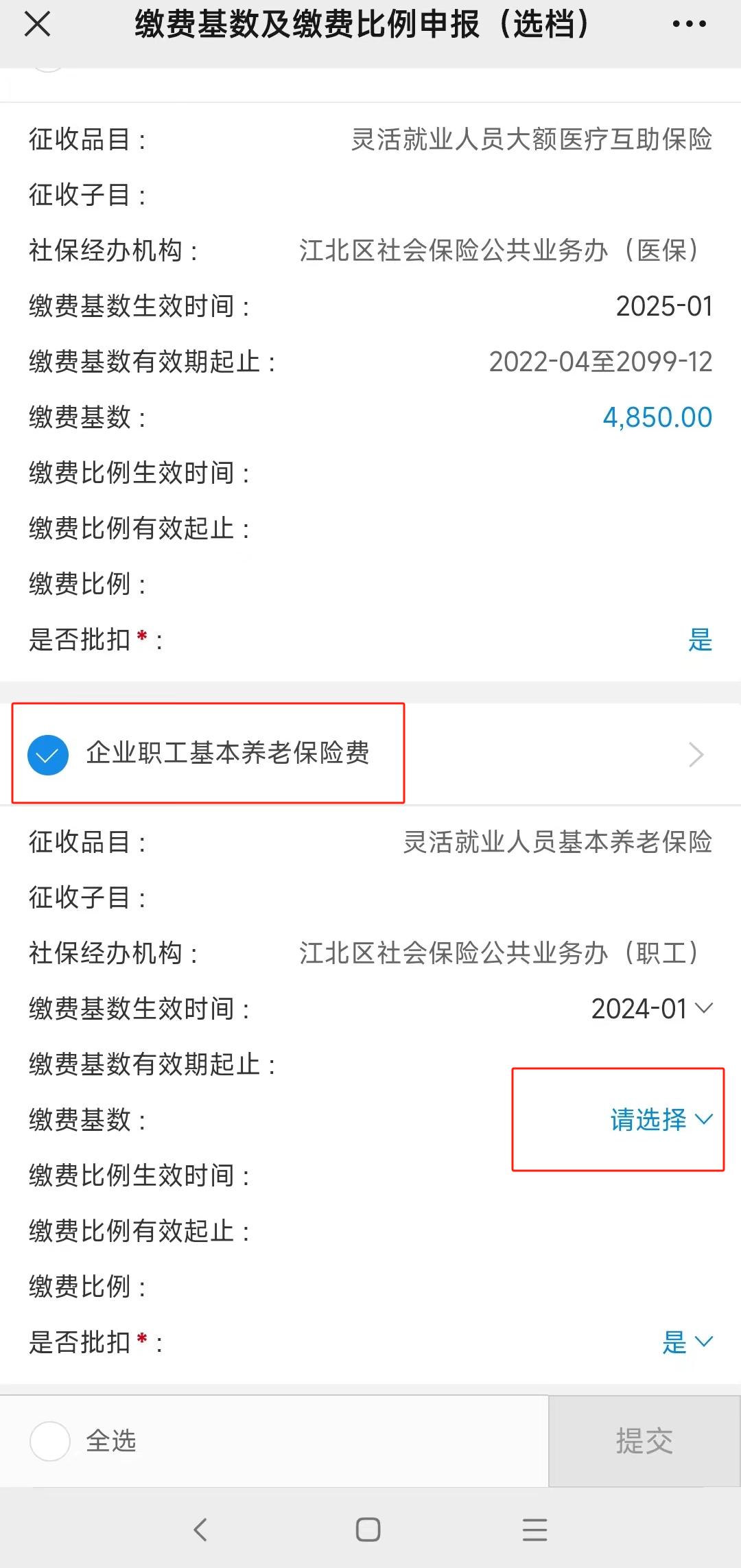 3.查看【企业职工基本养老保险费】,点击【缴存基数】,选择需要更改的缴费等级,点击【确定】,查看正确点击【提交】,看到“设置成功”意味着等级变更完成。