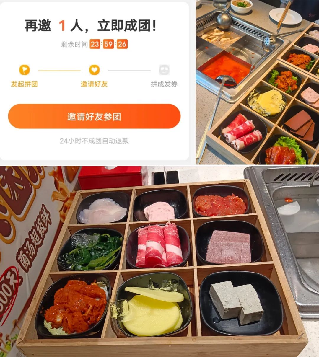 套餐包括一份锅底、一份食材、一份米饭/面条、一盘水果、一份柠檬汁和一份九宫格菜肴。价格方面,套餐有两种。他们成功拼单后可以享受折扣。优惠券后,59元的套餐是五荤四素,69元的套餐是六荤三素。