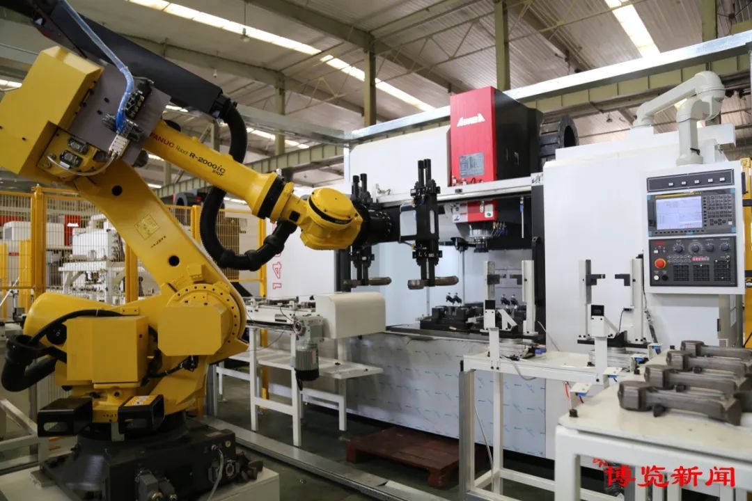 机器人在博山华成铸造有限公司智能生产车间精确抓取零件。
