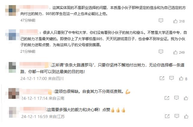 评论区的网友纷纷表示,“本质上还是年轻人坚强的意志!”“谁说职业教育不能有人才?只要你愿意努力,你的技能就是一个金饭碗。”“俗话说,条条大路通罗马”。