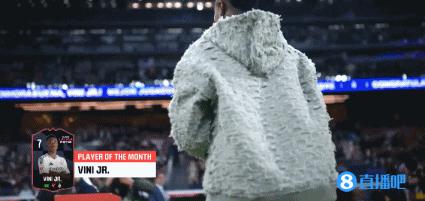 维尼修斯在比赛前进入球场,展示他在西甲月份的最佳奖牌。↓