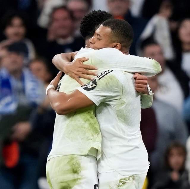 贝林厄姆代表性地张开双臂庆祝,队友们冲过来拥抱。姆巴佩看上去也很高兴,冲到贝林厄姆面前,伸出手拍了拍贝林厄姆的脸,看上去很亲密。