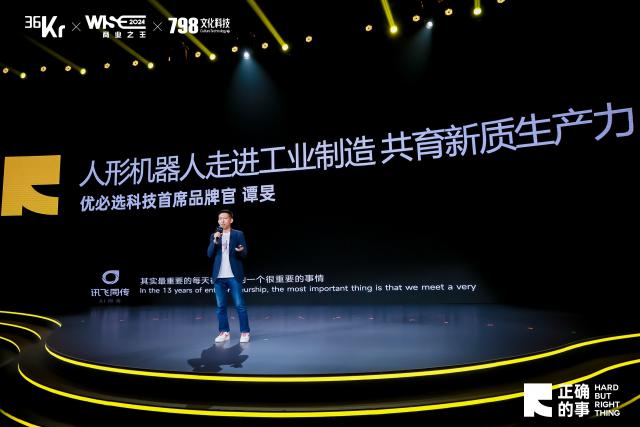 36 下午好,氪星的朋友们,我来自优必选谭邈,今天就和大家分享一下优必选创业近期。 13 多年来的一些思考。 36 氪 WISE 大会年度主题" Hard But Right Thing ”“特别符合我们目前的状态。