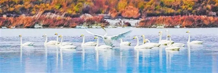 十一月九日,山西省运城市盐湖湿地野生大天鹅过冬,成为一道亮丽的风景。闫 鑫摄(中经视觉)
