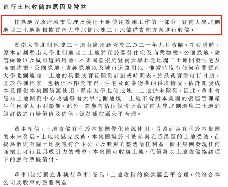 对暨南大学北部地块而言,退出了尚未开发的二块地块,最初的地价几乎是一样的50亿元,这次收储基本上就是原价退款。