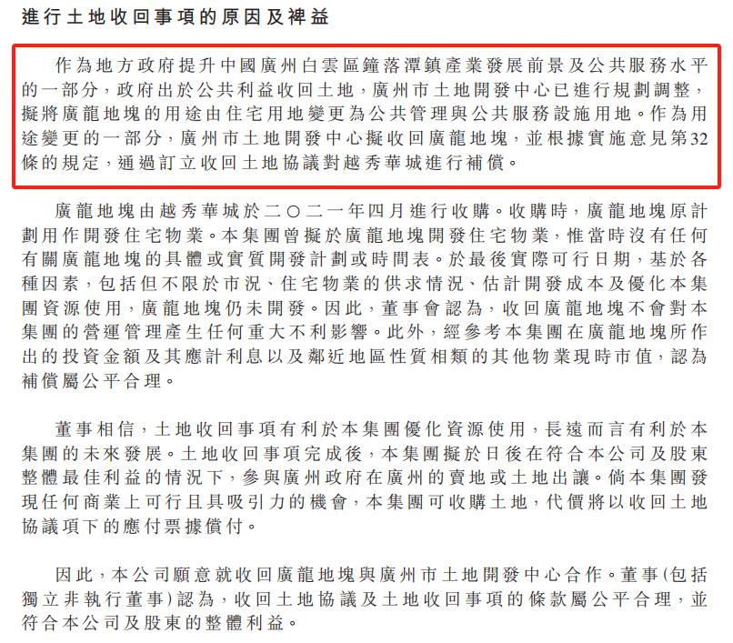 根据官方声明,越秀退的这三宗地,广龙路地块是为了改变控制规则,收回集体利益;