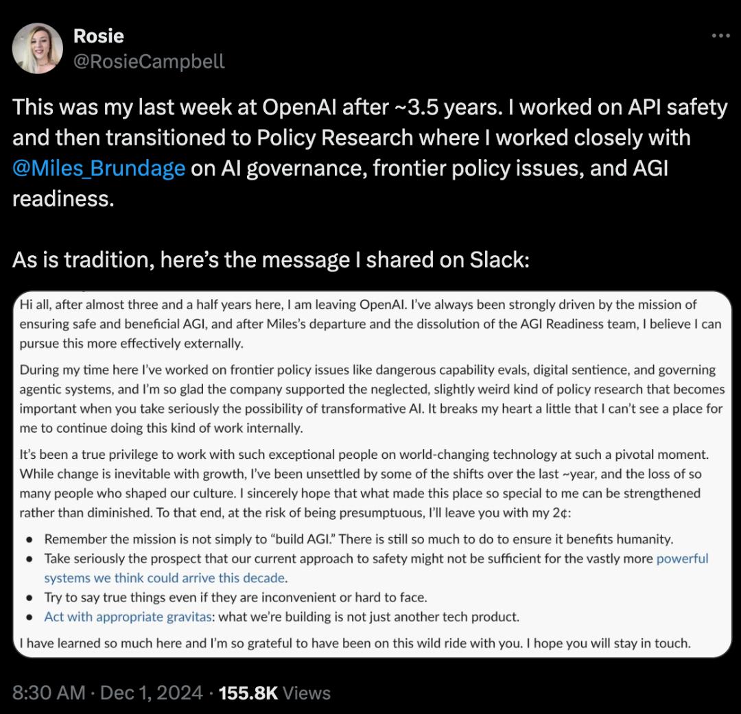 在X上,她说:“这是我在OpenAI工作了大约3.5年后的最后一个星期。首先,我API安全工作工作,然后转向政策研究部门,在那里我和@Miles与Brundage密切合作,共同研究人工智能治理、前沿政策和通用人工智能(AGI)准备工作。”