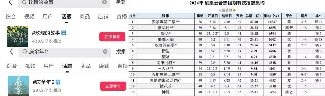 而且在数据方面,《玫瑰的故事》也陷入了和《永夜星河》一样的“爆短不爆长”争议。《玫瑰的故事》抖音的话题播放量达到400多亿,是《生活的乐趣2》的两倍,但其云集的平均播放量只有《生活的乐趣2》的一半。