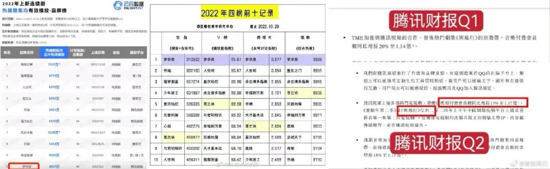 为了反驳“爆款剧”的质疑,《梦华录》剧粉创造了一个新的规范,通过招商广告数量和登上腾讯财务报告来识别爆款。毕竟这两个数据都和“利润”息息相关,也很有道理。