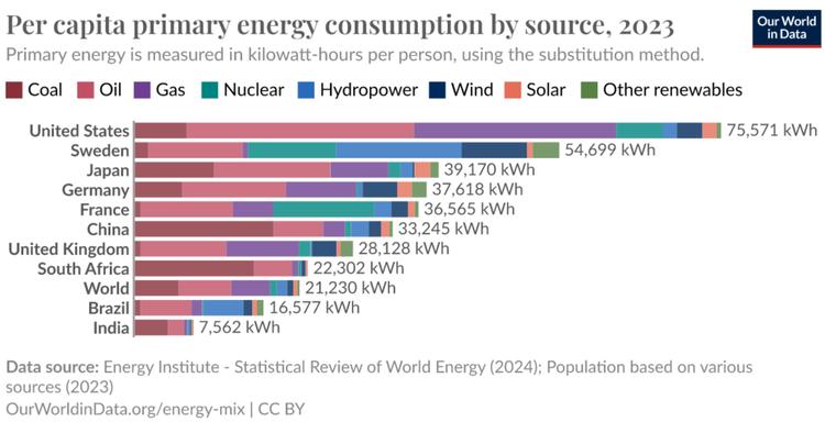 计算能力的背后是能源,发达国家与高能耗有着密切的联系,如果我们以人均发电量(千瓦时,kWh)通过对比图表可以看出。换句话说,获得能源过剩是文明进步的必要条件。毕竟,制造业、交通、公共服务、城市化和计算等新水平叠加在农业基本生存方面,需要能源支持。