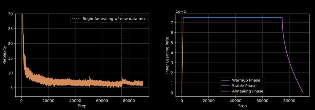 训练动态图表显示了模型困惑和学习率在整个训练过程中的变化,包括预热阶段、稳定阶段和退火阶段。