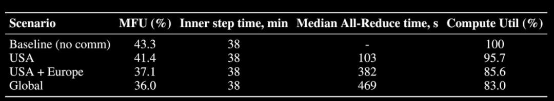 虽然训练散成了满天星,但是计算效率仍然保持不变「聚是一团火」高水平:在美国集群部署时,计算资源利用率高达 中位数同步延迟仅为96%( 103s);在跨越大西洋的部署场景中仍然保持着 85.6% 优异水平(中位数同步延迟 382s);甚至在全球分布式节点的配置下,计算利用率也可以保持稳定。 中位数同步延迟83%( 469s)。