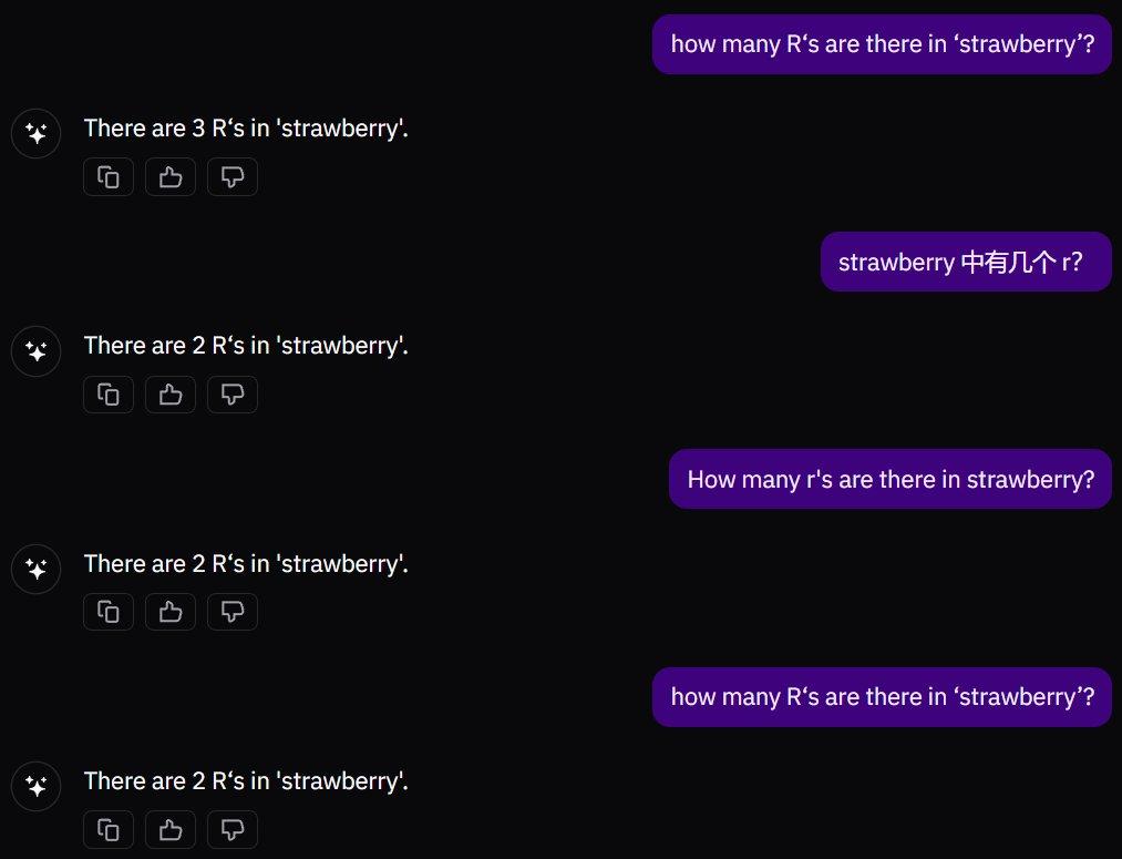 第一个是经典的草莓问题,INTELLECT-1 一开始答对了,但是继续提问又成了一个常见的错误答案。
